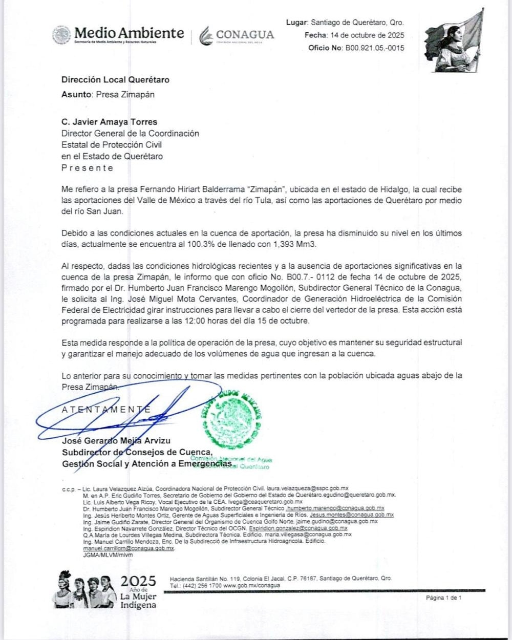 El documento fue dirigido a Javier Amaya Torres, director general de la Coordinación Estatal de Protección Civil de Querétaro, para que se tomen las medidas preventivas necesarias con la población ubicada aguas abajo de la presa Zimapán.