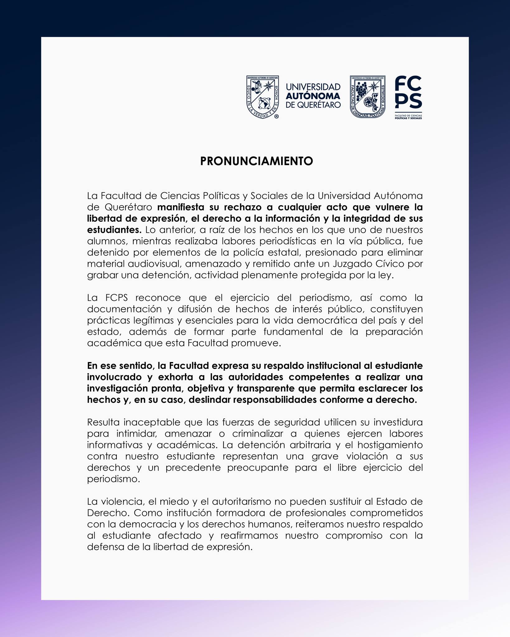 Ante lo ocurrido, la Facultad de Ciencias Políticas y Sociales (FCPS) de la UAQ emitió un pronunciamiento en el que condenó los hechos, expresó su respaldo institucional al alumno y exigió a las autoridades competentes una investigación pronta, objetiva y transparente que permita esclarecer lo sucedido y deslindar responsabilidades.