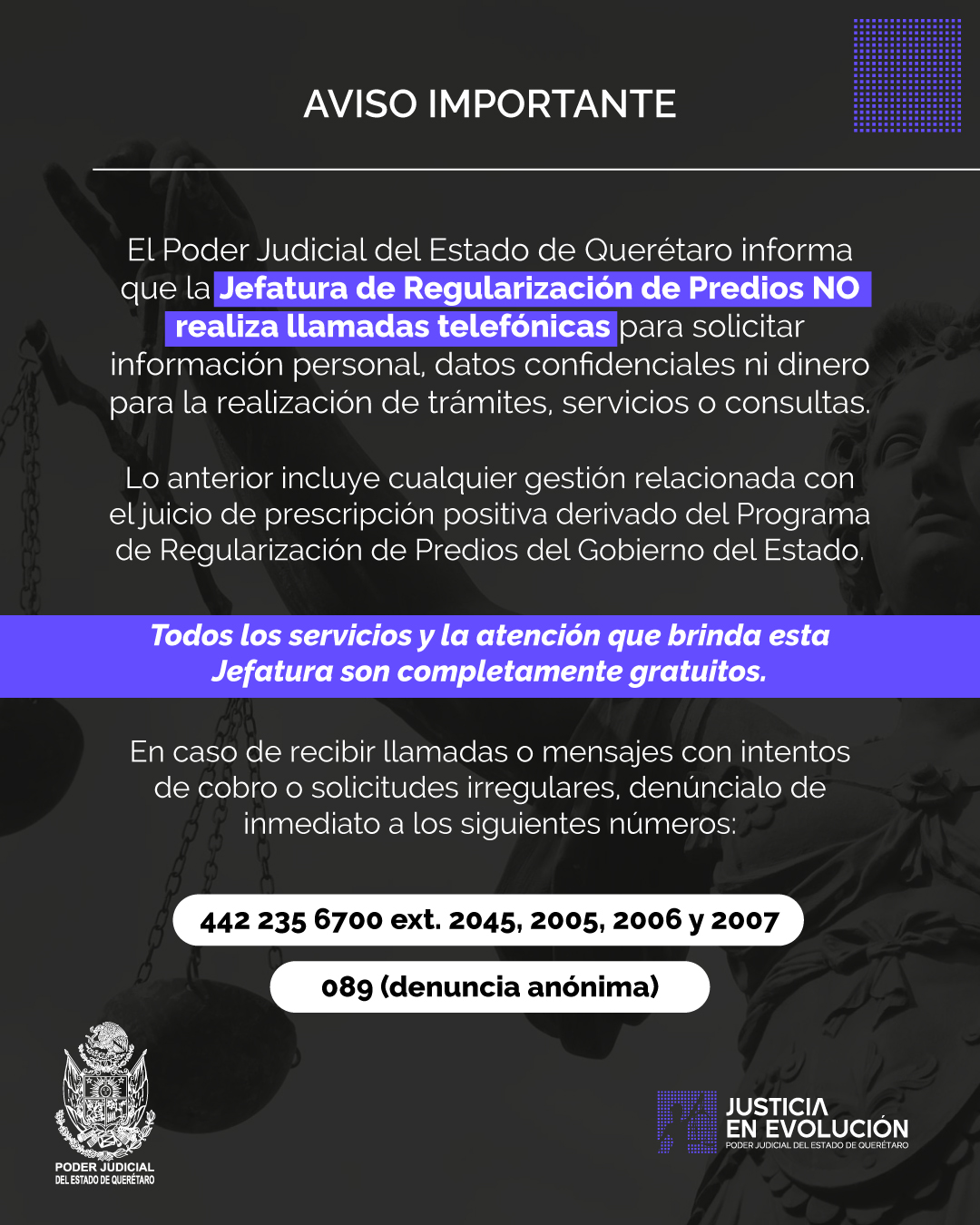 A través de sus redes sociales, el Poder Judicial del Estado de Querétaro emitió una advertencia dirigida a la ciudadanía ante la detección de llamadas telefónicas fraudulentas realizadas a nombre de la Jefatura de Regularización de Predios.