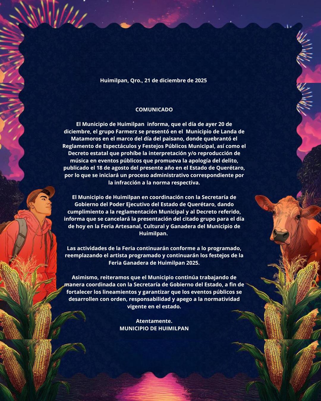 Por su parte, el Municipio de Huimilpan informó que, en coordinación con la Secretaría de Gobierno del Poder Ejecutivo del Estado, decidió cancelar la presentación de Los Farmerz, programada para el 21 de diciembre en la Feria Artesanal, Cultural y Ganadera 2025, tras confirmarse la infracción cometida en Landa de Matamoros y en atención al decreto estatal publicado el 18 de agosto, que prohíbe expresamente la difusión de música que promueva la apología del delito en eventos públicos.