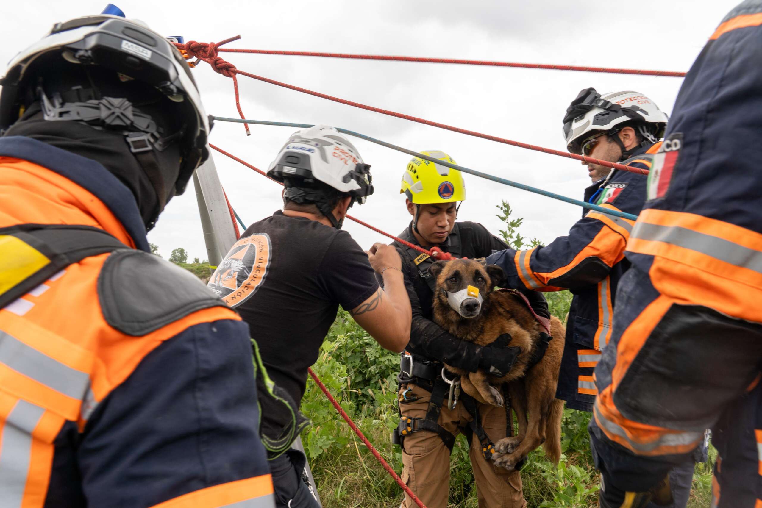 Con ayuda de un tripié especial y un sistema de poleas, un rescatista descendió de manera segura hasta donde estaba el perro, logrando recuperarlo junto con el equipo de manera exitosa.