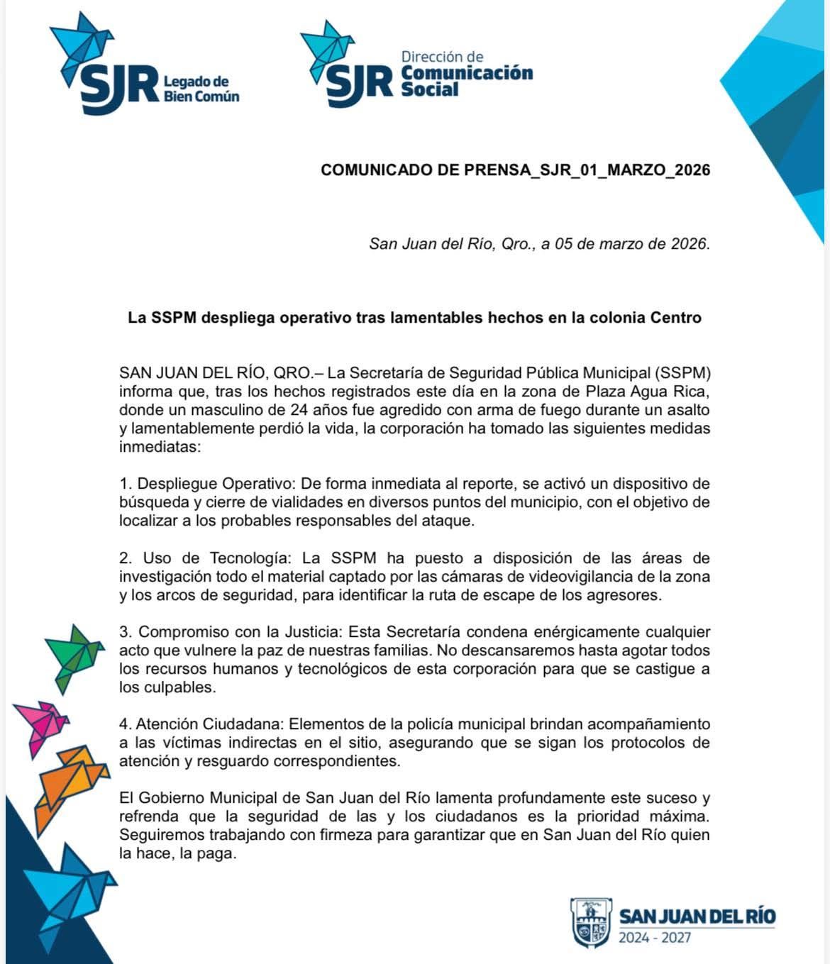 Un hombre de 24 años perdió la vida tras ser agredido con arma de fuego durante un asalto ocurrido en la zona de Plaza Agua Rica, en la colonia Centro de San Juan del Río, informó la Secretaría de Seguridad Pública Municipal (SSPM).